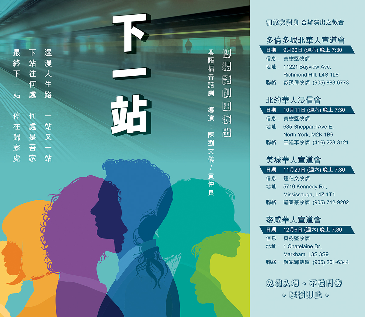 福音話劇——下一站 號角月報加拿大版 二零二五年十月 加拿大號角合辦·傳揚話劇團演出2025年9月至12月連演四場敬請關注 號角 上題:加西教會及社區消息:10月份加西教會及社區消息 下題:2025加拿大號角異象分享會-溫哥華實體午宴